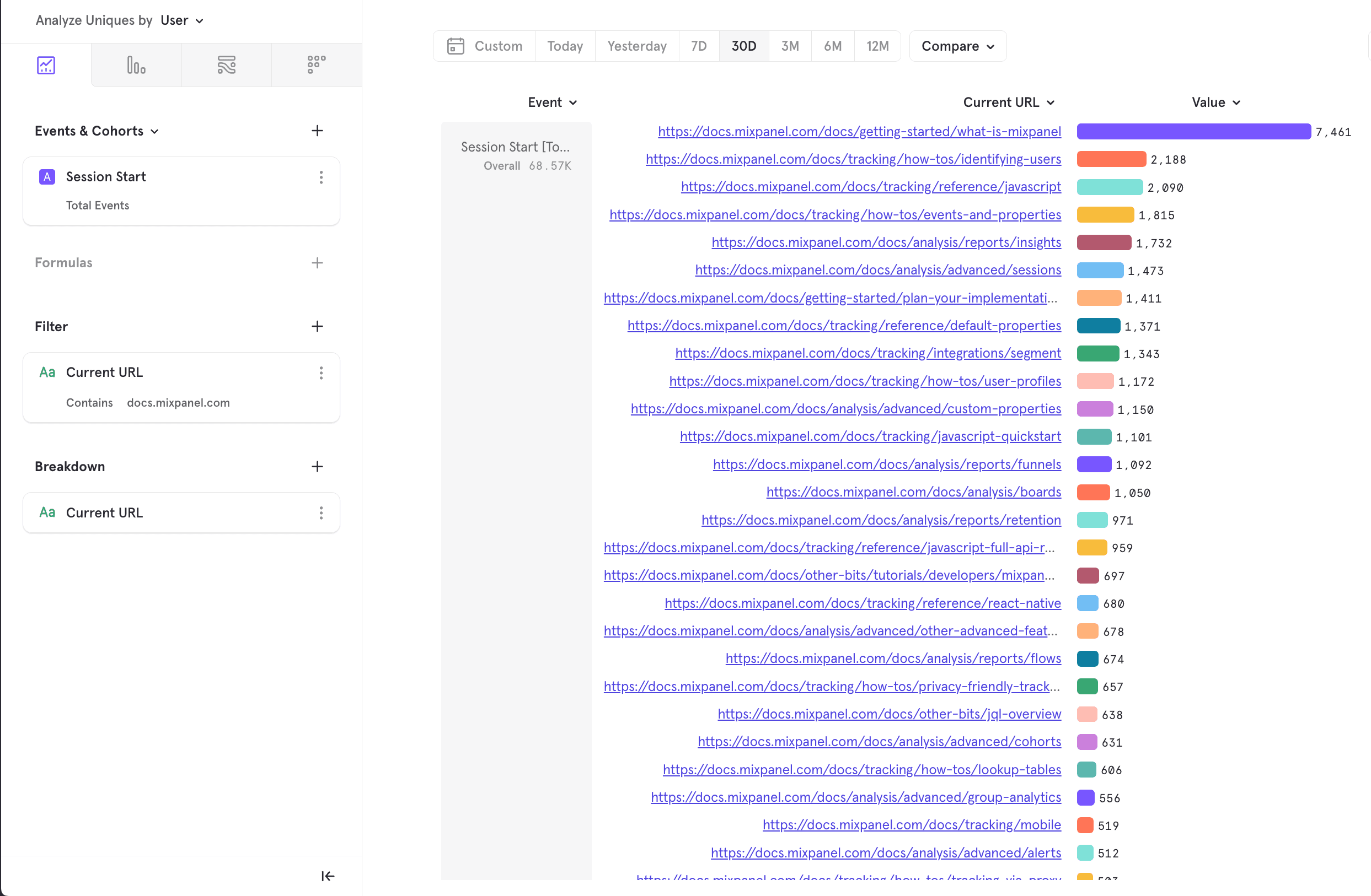 Here we see that the most common landing page is the "What is Mixpanel?" page of our docs, followed by the page on "Identifying Users". We might use this insight to decide which parts of our documentation to invest more in.